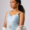 Design description: blue braid embroidery, knee length zipper at back