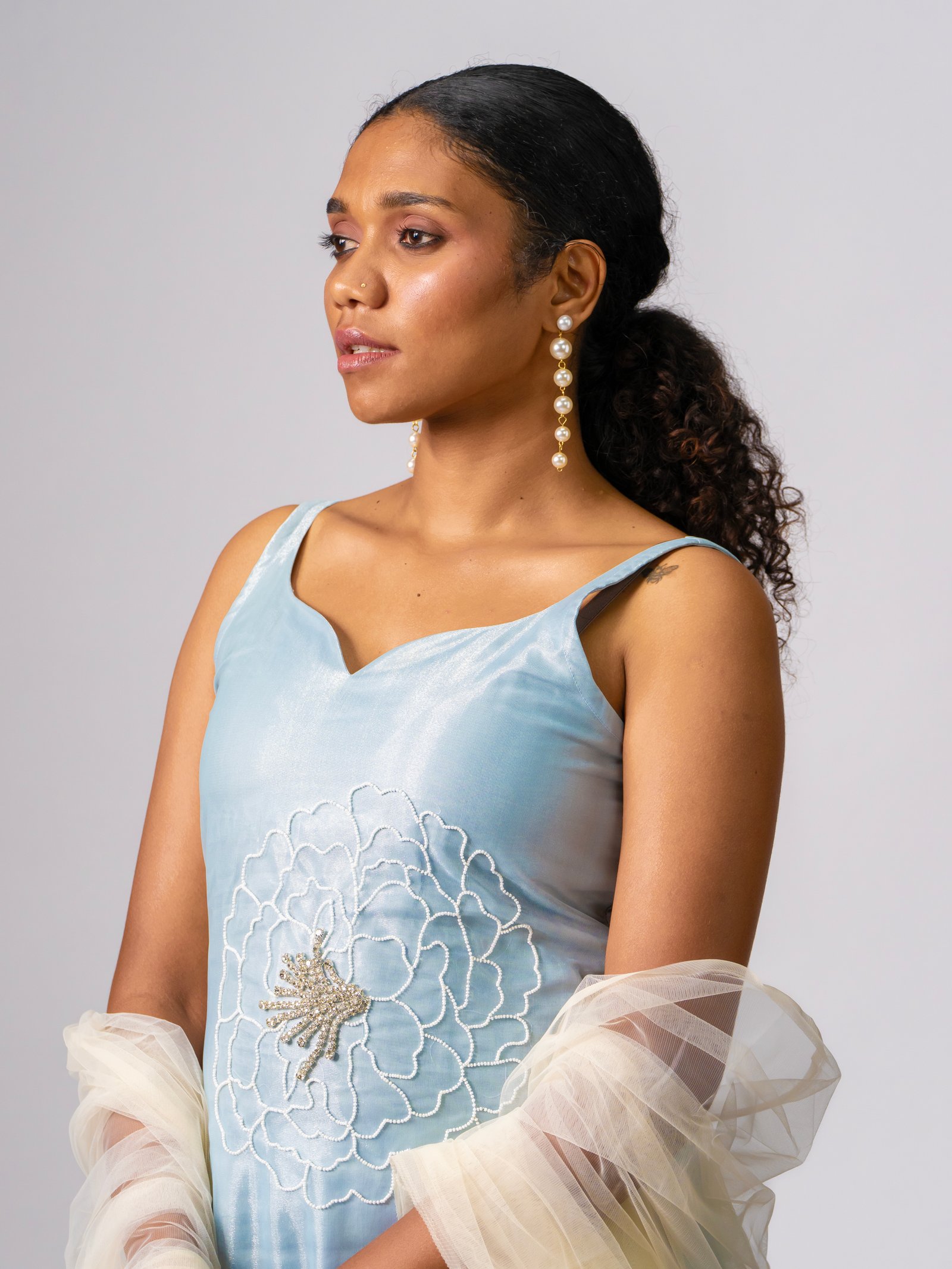 Design description: Kurti collar v henley neckline with floral hand embroidery, organza dupatta
